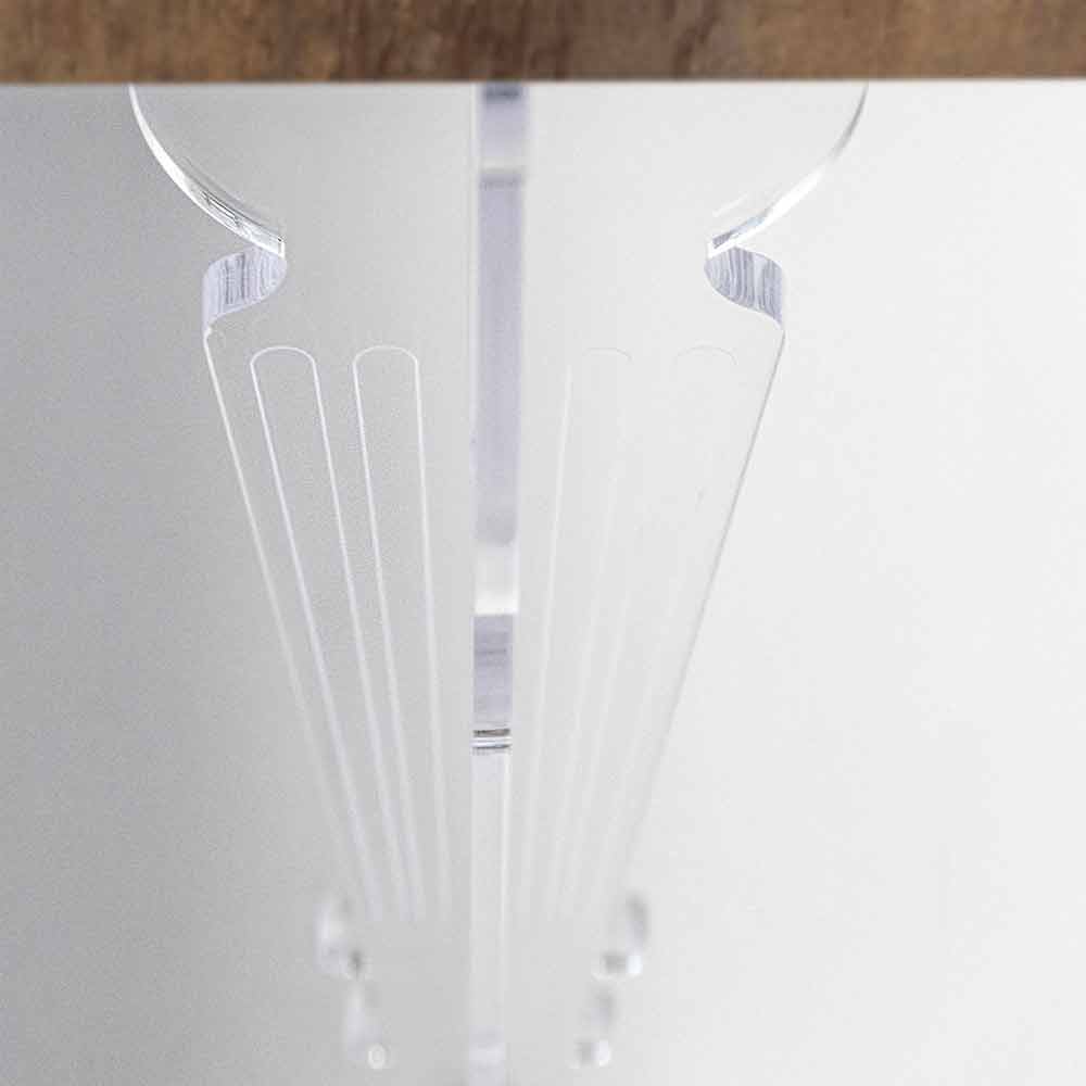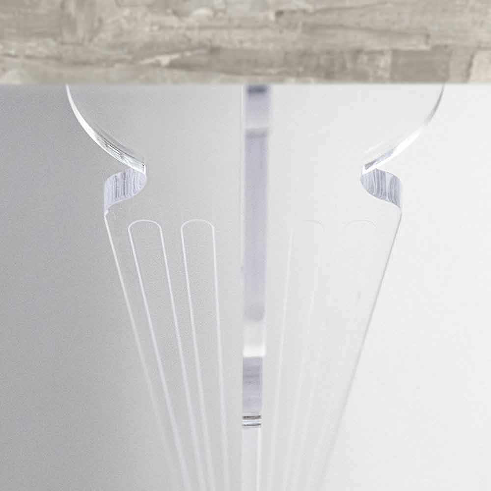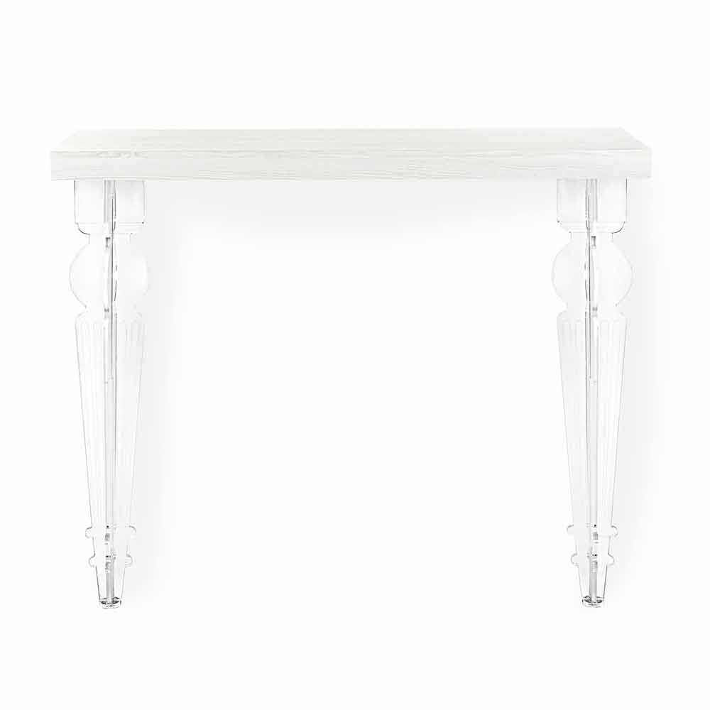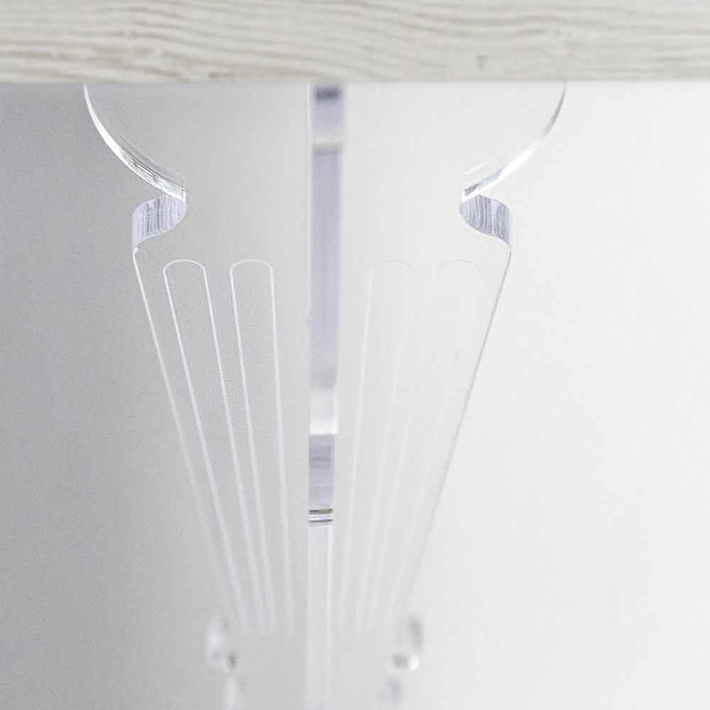 turned legs in pure PMMA plexiglass from virgin acrylic crystal polymer combined with the top in melamine wood essence, with a natural matt brushed finish, create an effect of