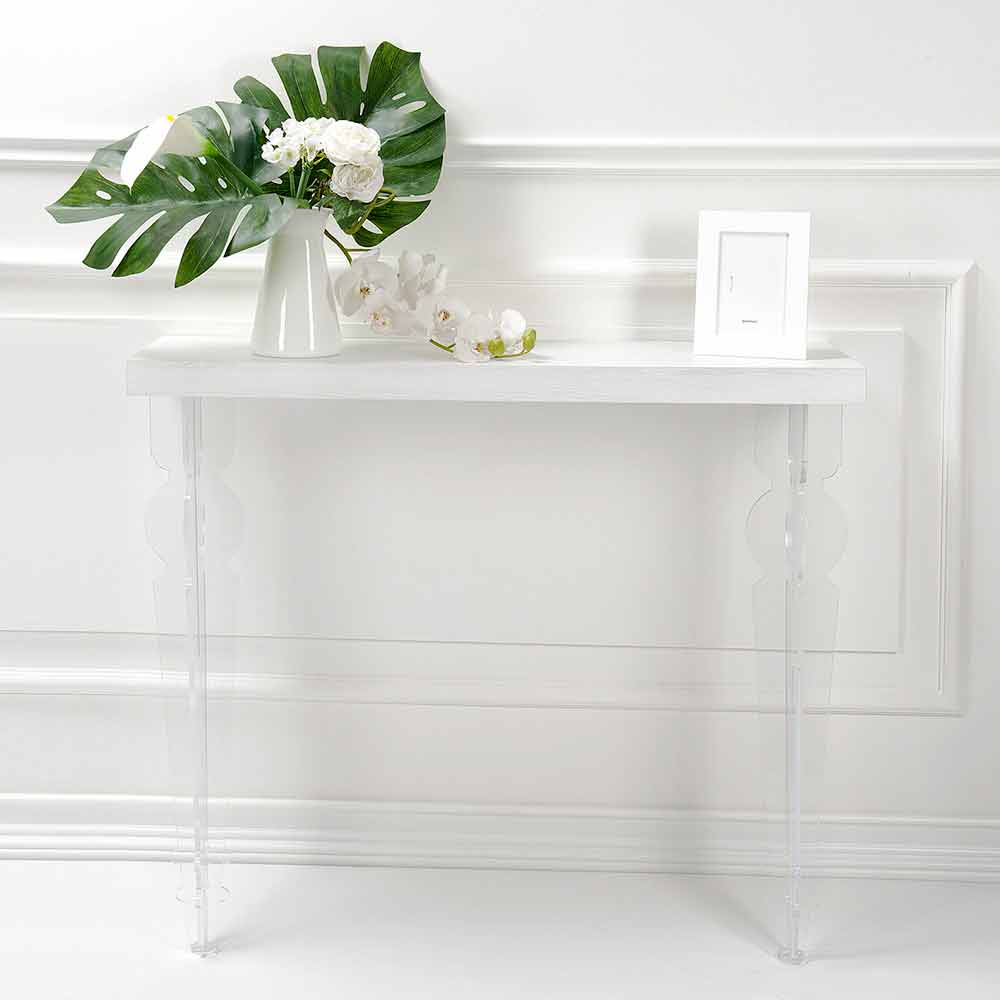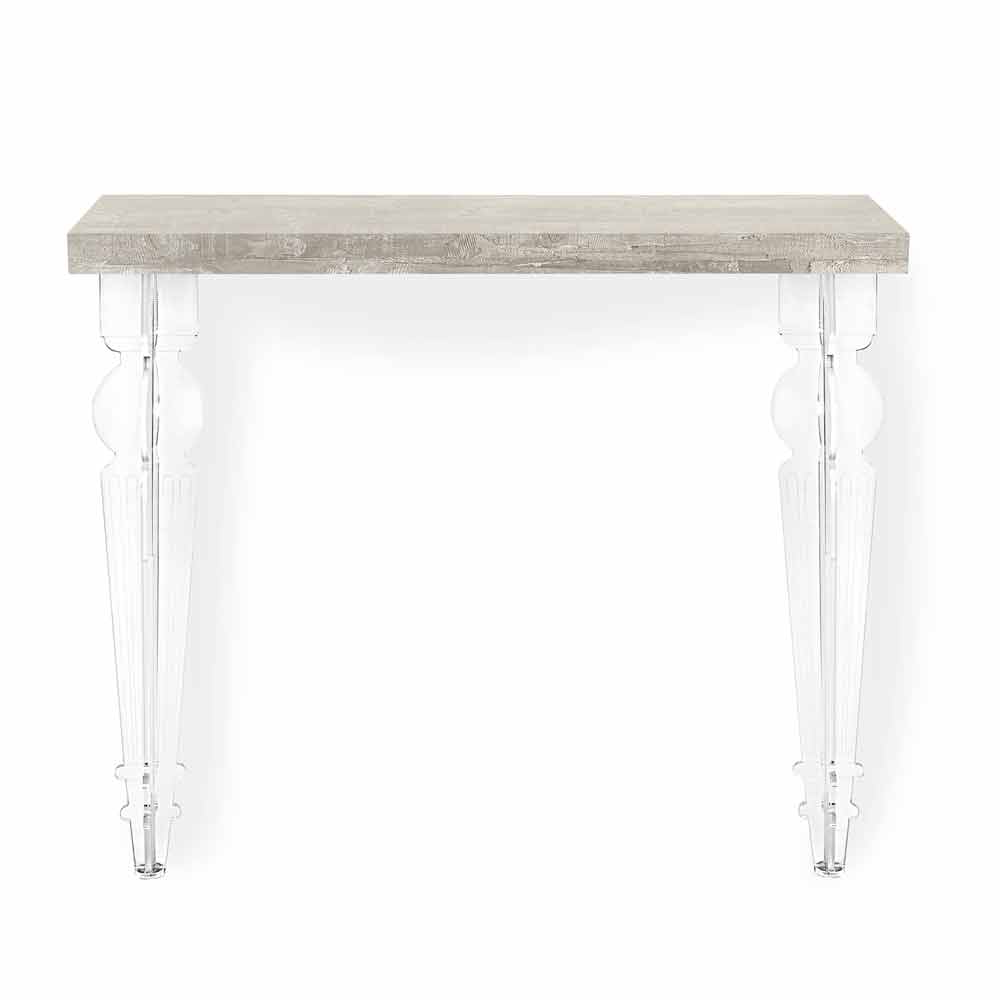 Wall console table in white, grey or corten wood with turned legs in plexiglass, design made in Italy.