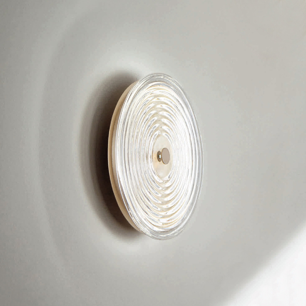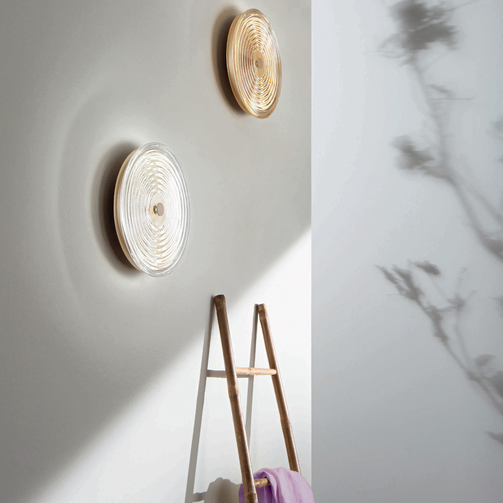 Wall light entirely produced in Italy made of gold finish painted metal, glass decorated with concentric lines with LED light.