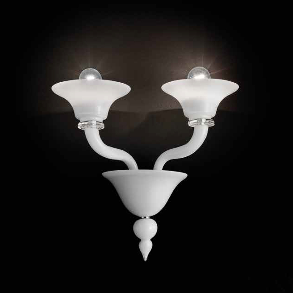 2-light wall lamp made in Italy in Venice glass with milk white finish - hand- crafted crystal with metal details in polished chrome finish . An unprecedented encounter between historical lines and contemporary design to give life to a piece of furniture with timeless charm and elegance. Its aesthetic is characterized by an articulated volume that becomes dynamic and light through the luminous vibration of the marvellous blown glass surfaces that alternate the elegant transparent arms with the cups made through the use of the casing technique . To underline its value is the attention to detail that transpires from the chromed metal components which allow the product to adapt to different tastes and situations of use.