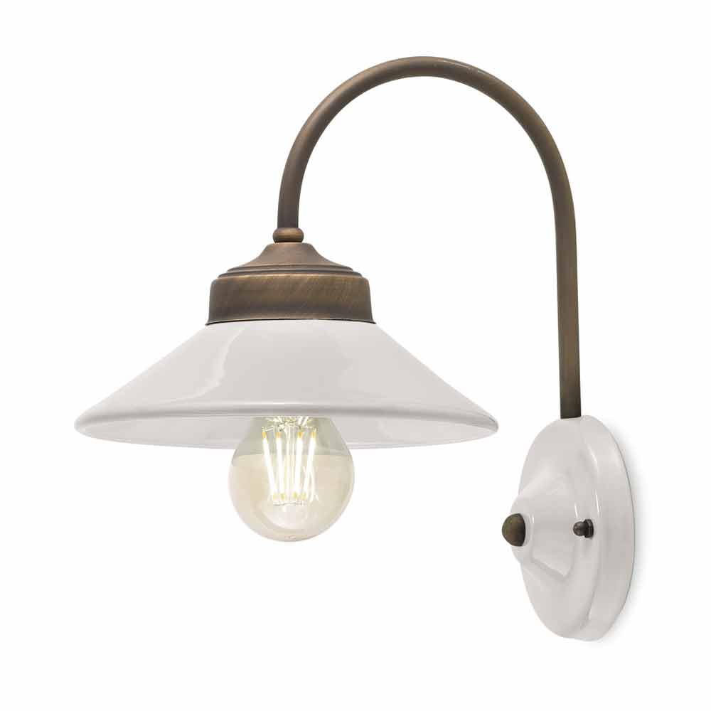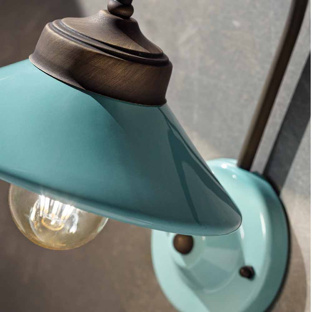 This beautiful wall lamp consists of an antique brass structure with a diffuser made of glossy colored ceramic, available in different colours.