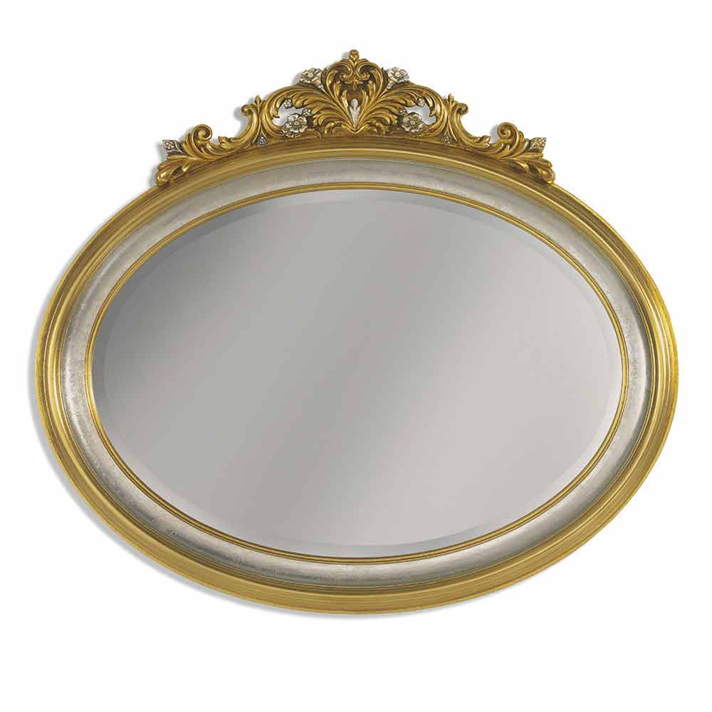 Its regal design is topped with an intricate ornament that crowns the mirror, adding a point of visual interest and a feeling of height and grandeur to the wall on which it hangs. The oval shape of the reflective surface offers a soft and welcoming vision, ideal for spaces where you want to add a sense of intimacy and refinement.