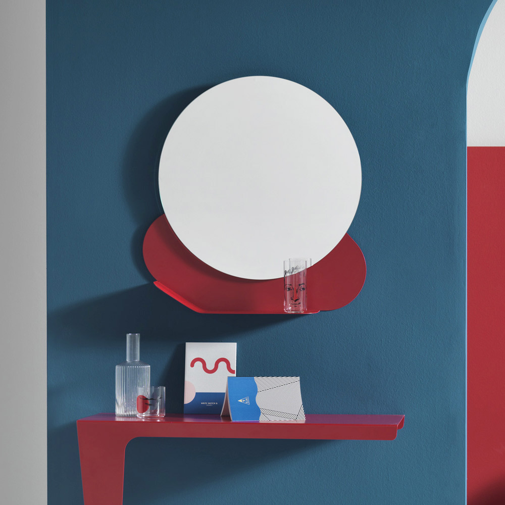 This modern design wall mirror fits into young contexts thanks to the lower shelf in colored metal with lively and contemporary colours, which delimits the round shapes of the mirror and creates continuity with the surrounding environment. A practical and functional product with an original and sparkling design able to characterise different contexts, from the entrance to the lounge as well as in the bathroom or bedroom.