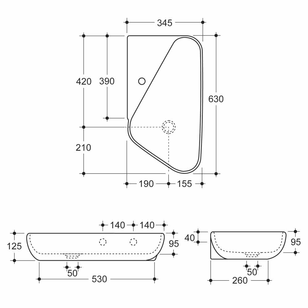 Design washbasin with a triangular basin, equipped with a shelf for housing the tap and soap.
