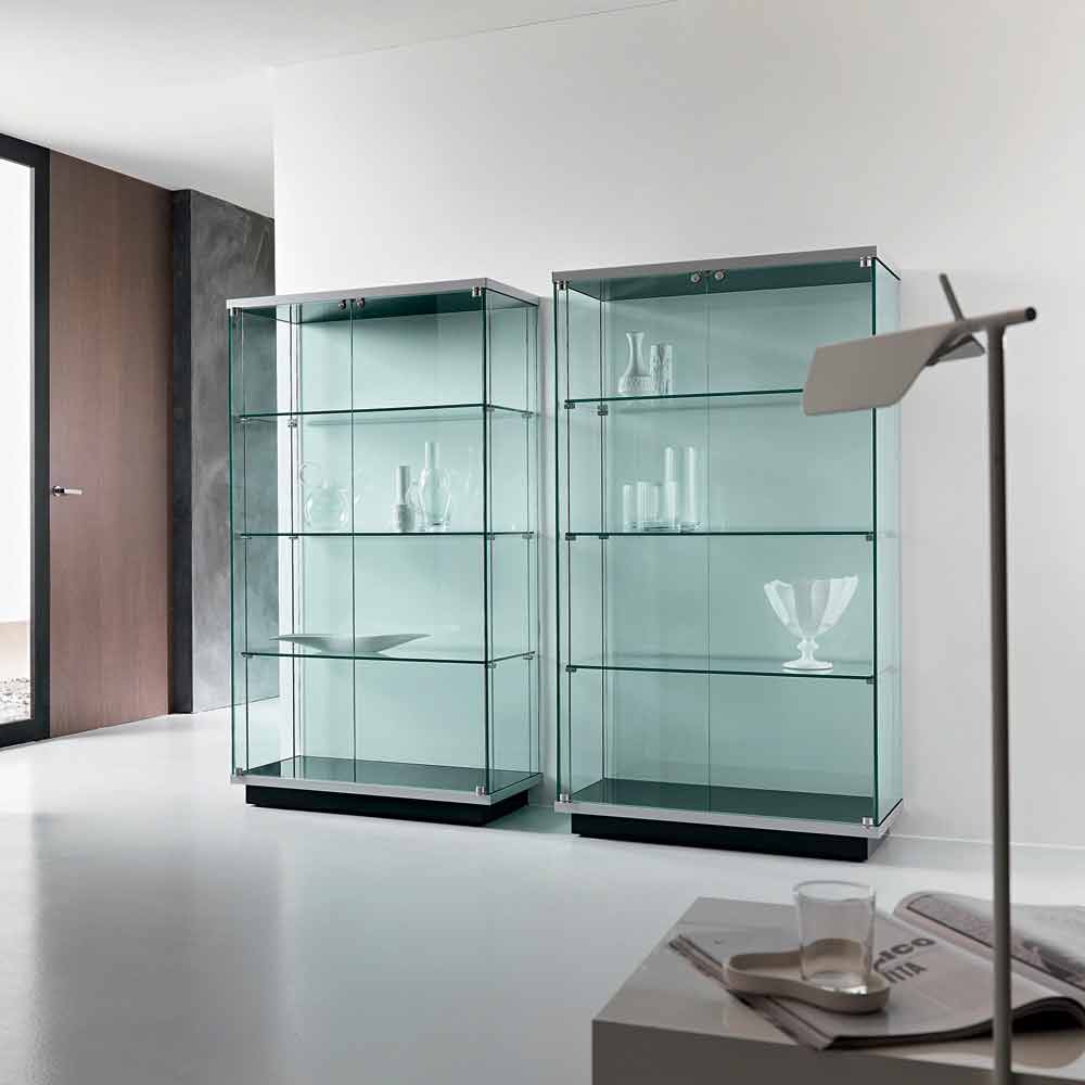 The two-door display cabinet with lock is entirely made of transparent tempered glass with three shelves with base, top and plinth in black lacquered wood.