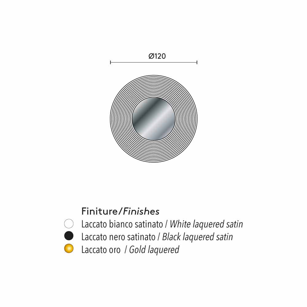 Designer mirror with a lacquered MDF support which is available with satinized white, satinized black or gold finish.