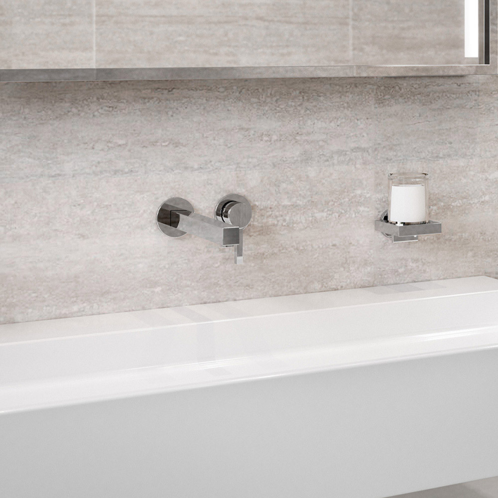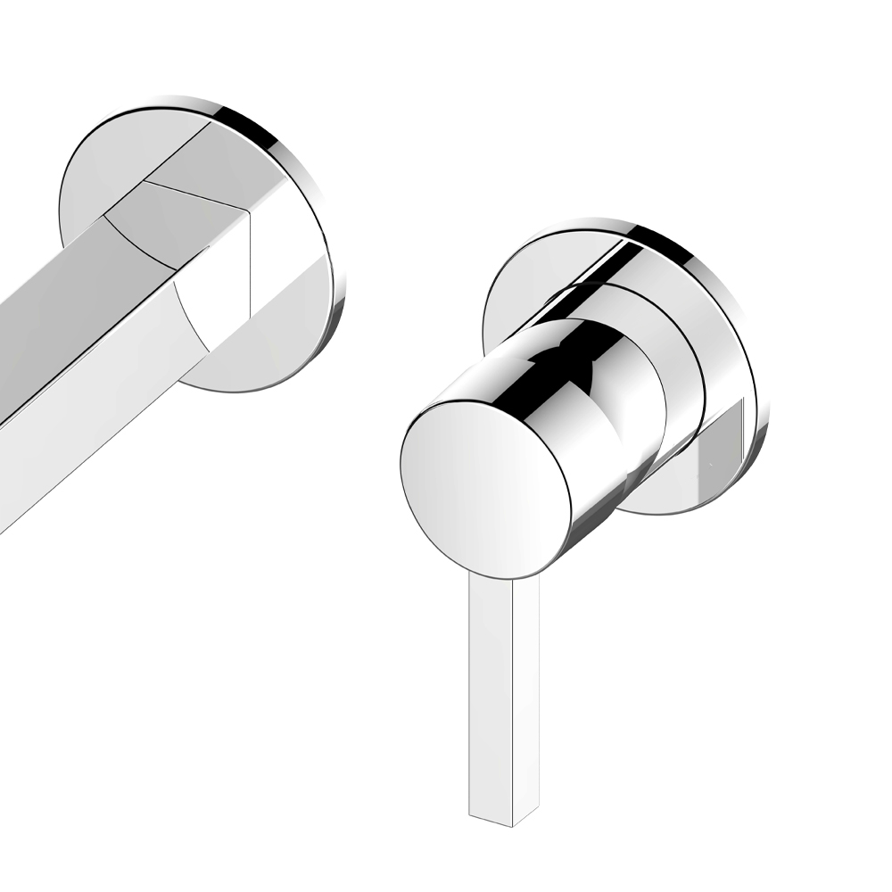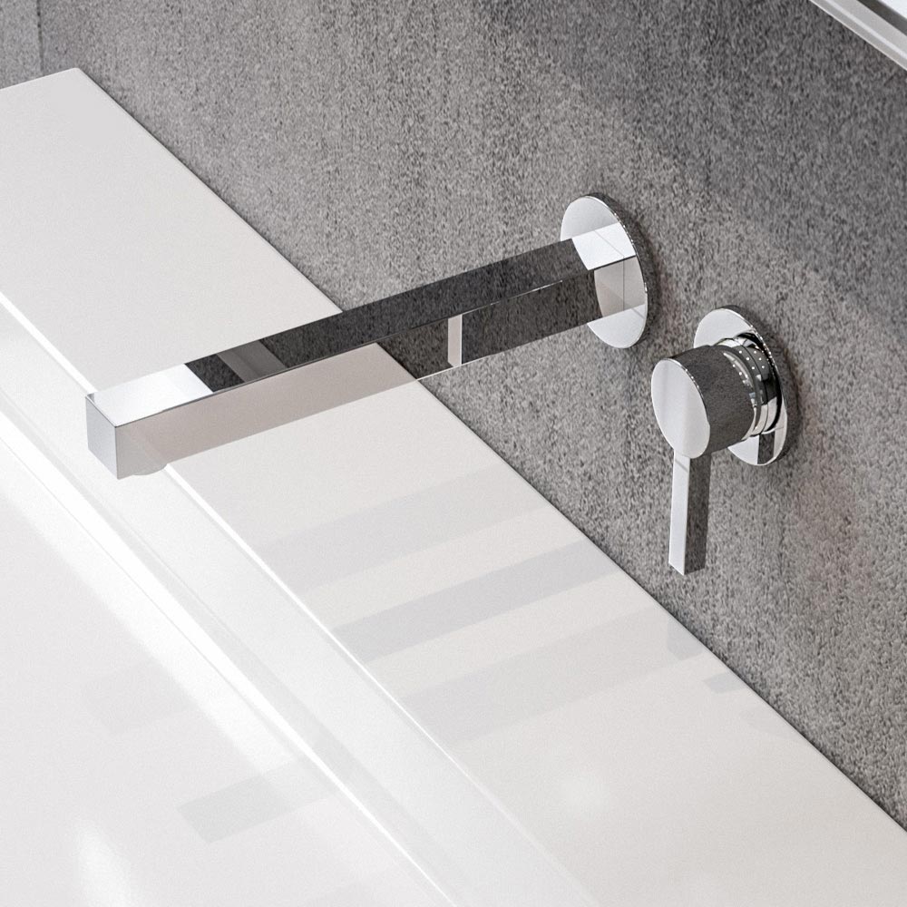 This wall mounted single lever basin mixer features a square design on round elements. It is a tap with clean and essential geometric linesmade of chromed brass with high quality materials.