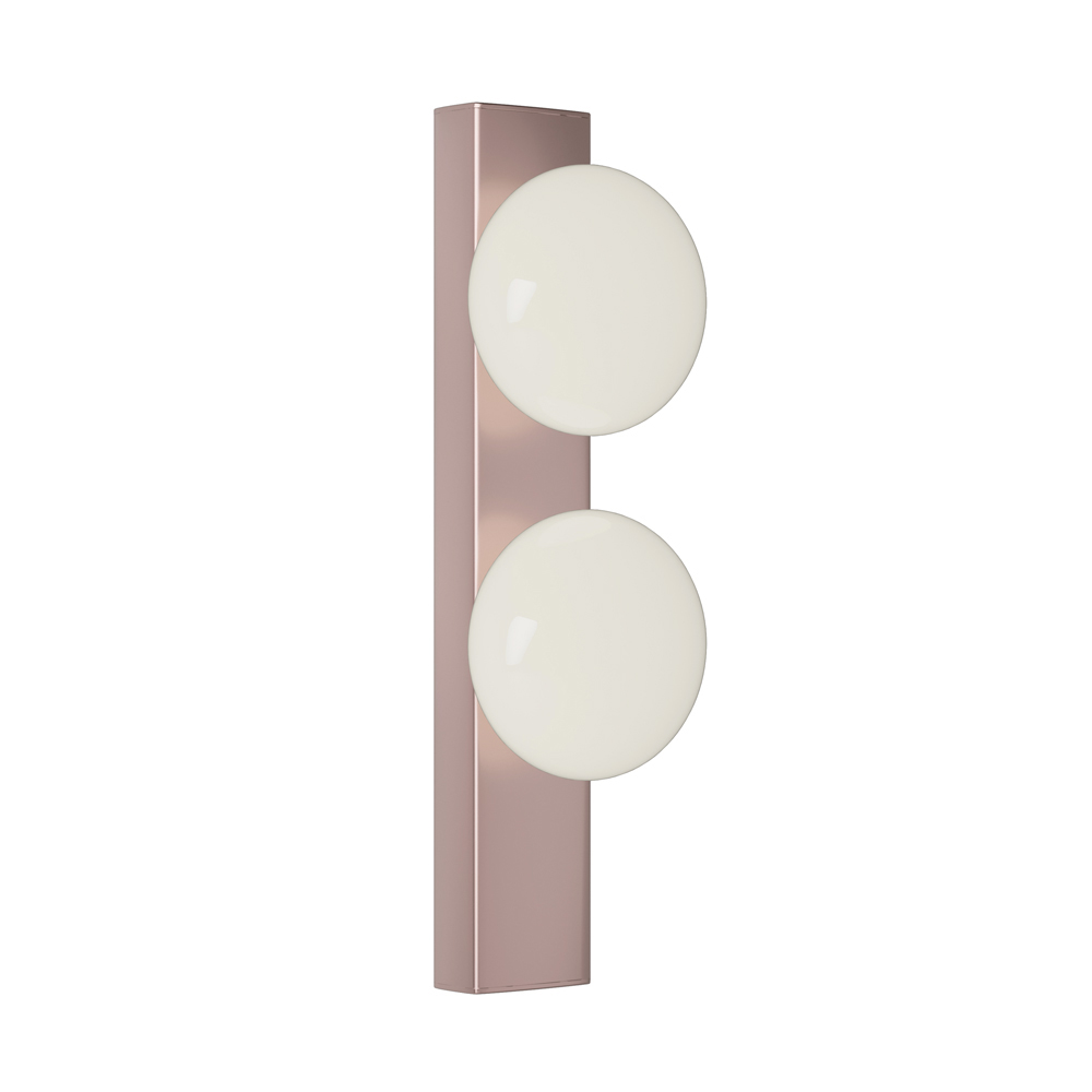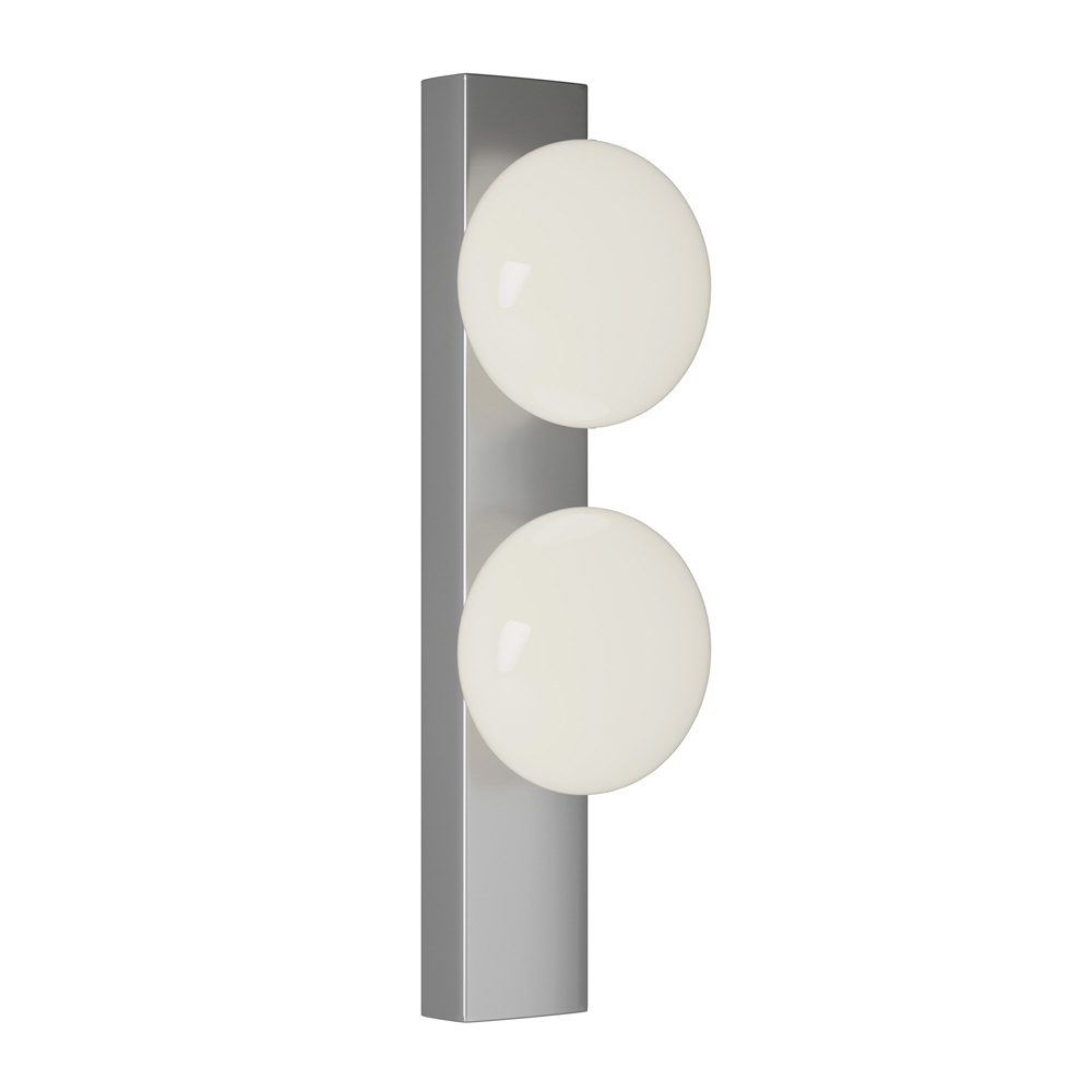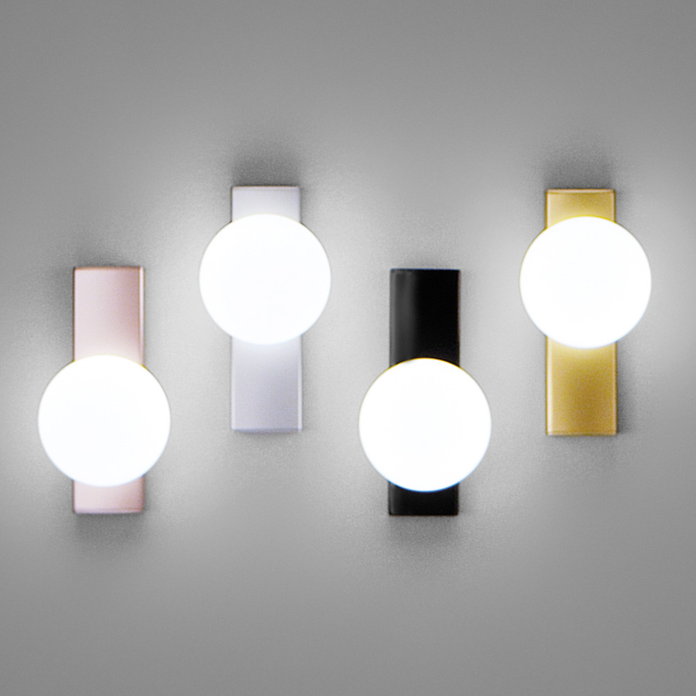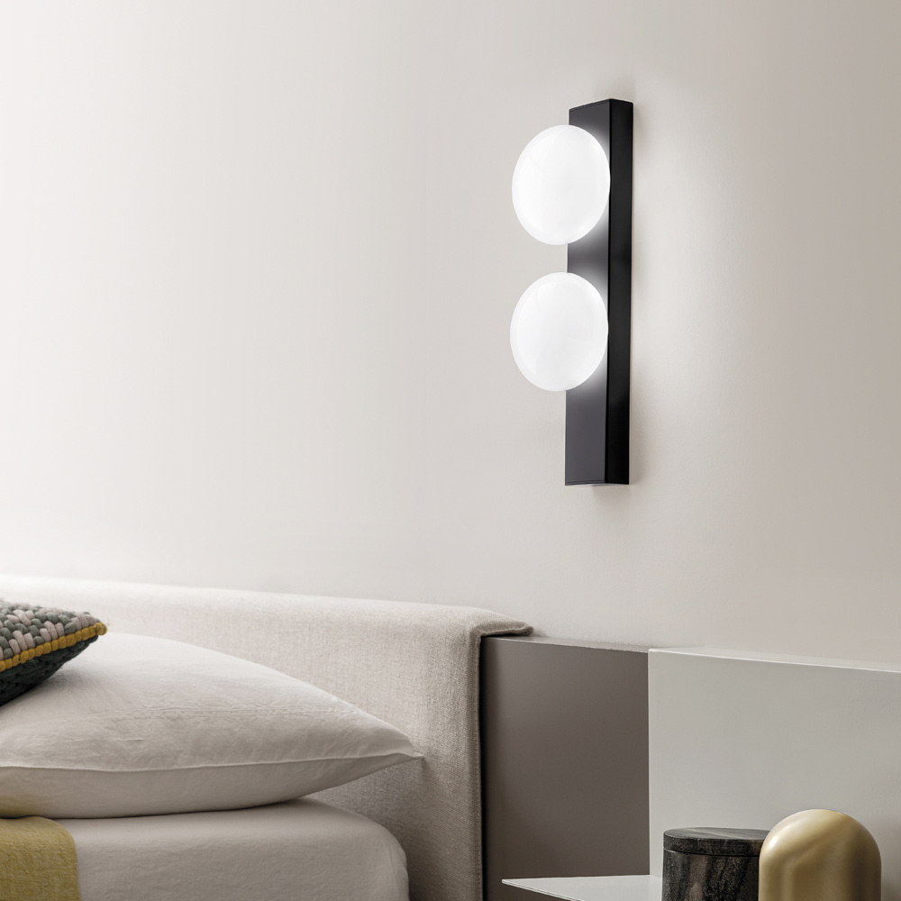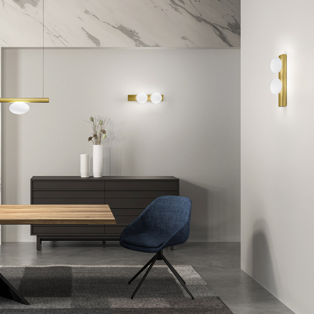 This wall light is the perfect blend of geometric design and refined minimalism . The essential composition is enhanced by one or two luminous opal glass spheres , which diffuse a soft, welcoming light, ideal for creating relaxing and sophisticated atmospheres.