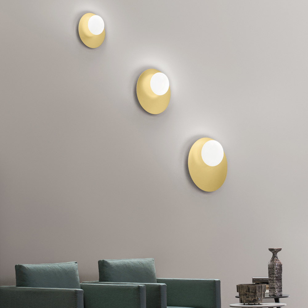 This wall light is a true example of minimalist and elegant design , perfect for those who want to embellish their spaces with clean lines and refined materials . The round metal structure embraces a spherical white glass diffuser, creating a pleasant contrast between geometric shape and soft light .