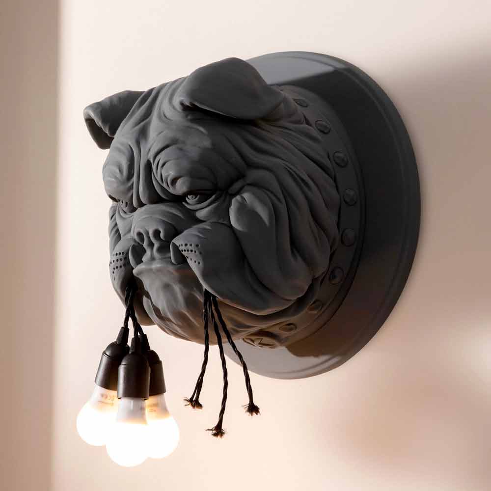 Wall sconce with 3 lights in white or grey ceramic in the shape of a bulldog, handcrafted item made in Italy.