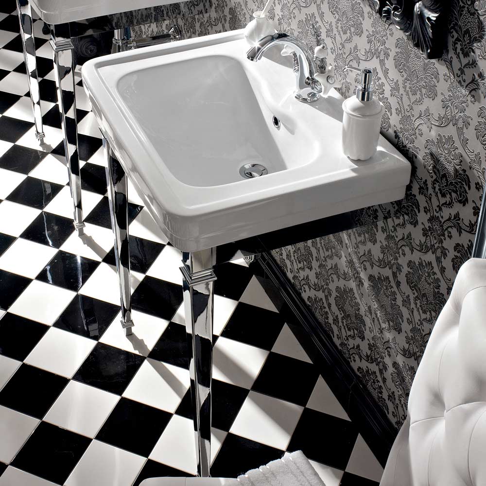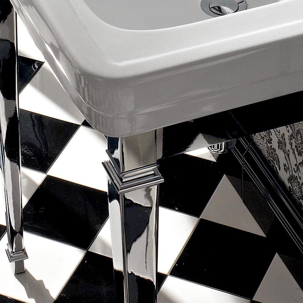 The style of this console sink can be defined as neoclassical: design and retro queues are combined with materials with a more modern character, such as metal.