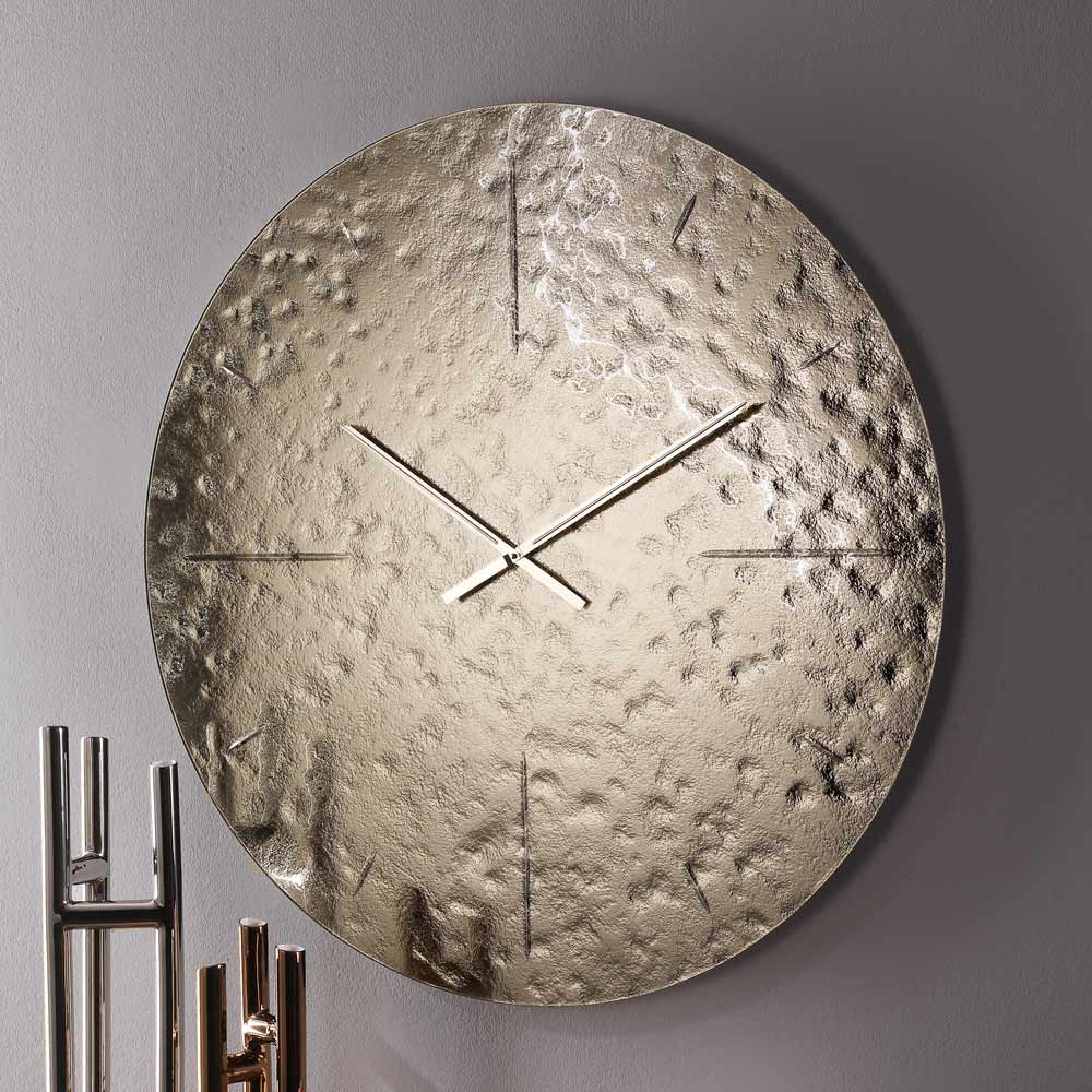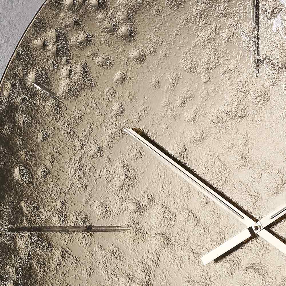 The wavy fused glass wall clock with a bronze finish is a striking furnishing accessory, combining craftsmanship and contemporary design. The textured surface, characterized by irregularities and three-dimensional textures, creates refined plays of light that make each piece unique.