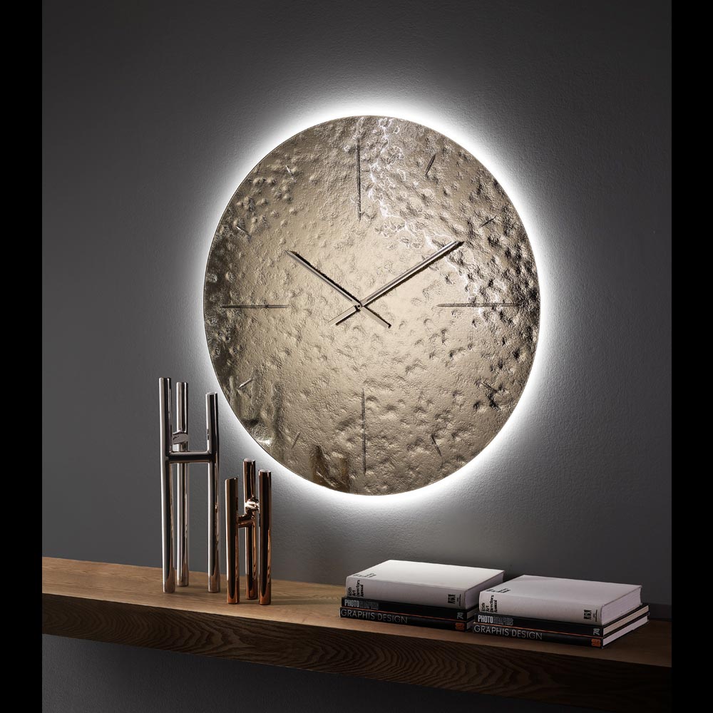 A wall clock with a bold and sophisticated character, designed for those who desire an exclusive furnishing element capable of enhancing the wall with light and material.