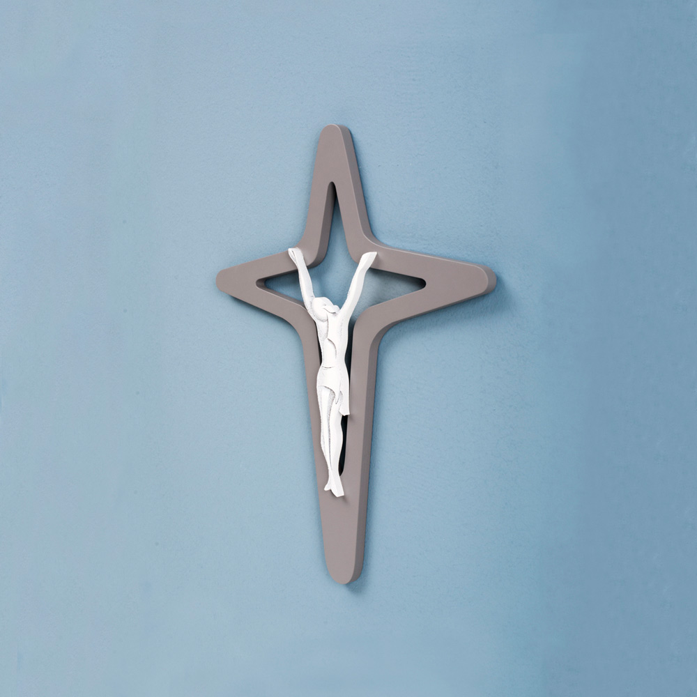 Crucifix in gray lacquered wood with application of Christ in white lacquered wood with light incisions to highlight the features of the body .
