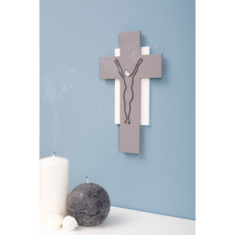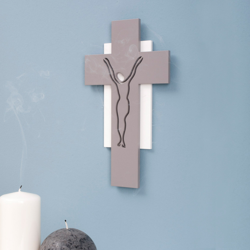 Gray lacquered wood crucifix with laser cut silhouette of Christ Crucified in contrast with white lacquered wood rectangle .