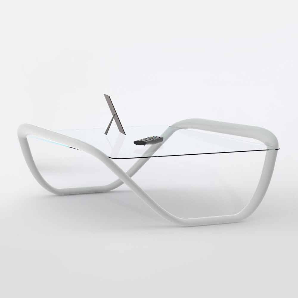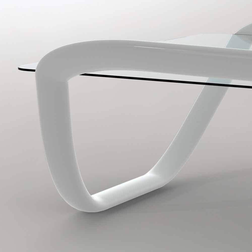 Coffee table made with Solid Surface structure; for a proposal characterized by the simple and suggestive sign of a sinuous continuous queue. An essential formal solution, able to personalize the environment. The transparency of the glass top allows to emphasise the soft queues of the structure. A unique shape in the continuity of space. Featuring a glossy / matte white lacquer finish (RAL9003).