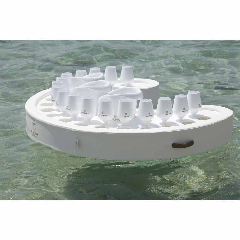 The floating pool bar by Trona has been conceived for pool cocktail parties. Its made of eco-friendly nautica faux leather, EPS and it has a plexiglass plate. The faux leather used to make it is designed for outdoors and it is certified, water-resistant and fireproof. It is provided with practical nautical rope handles, 3 ice cube/bottle holders and 17 glass holders. It is completely cutted and hand-sewn in Italy.