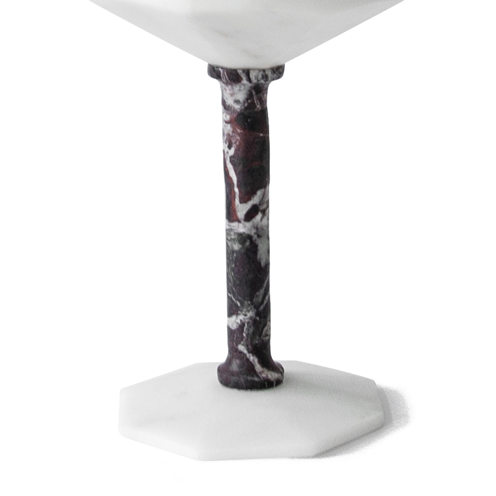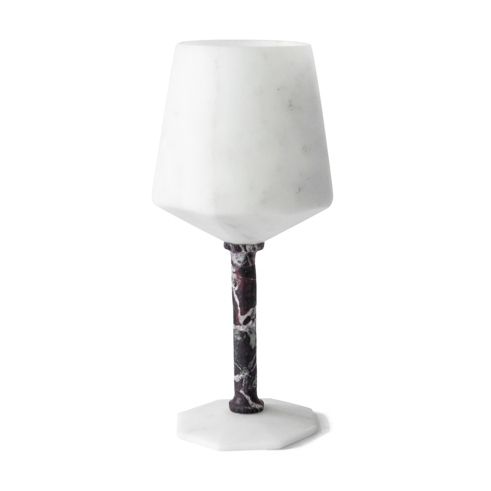 Wine glass in satin white Carrara marble and red Levanto, design made in Italy.