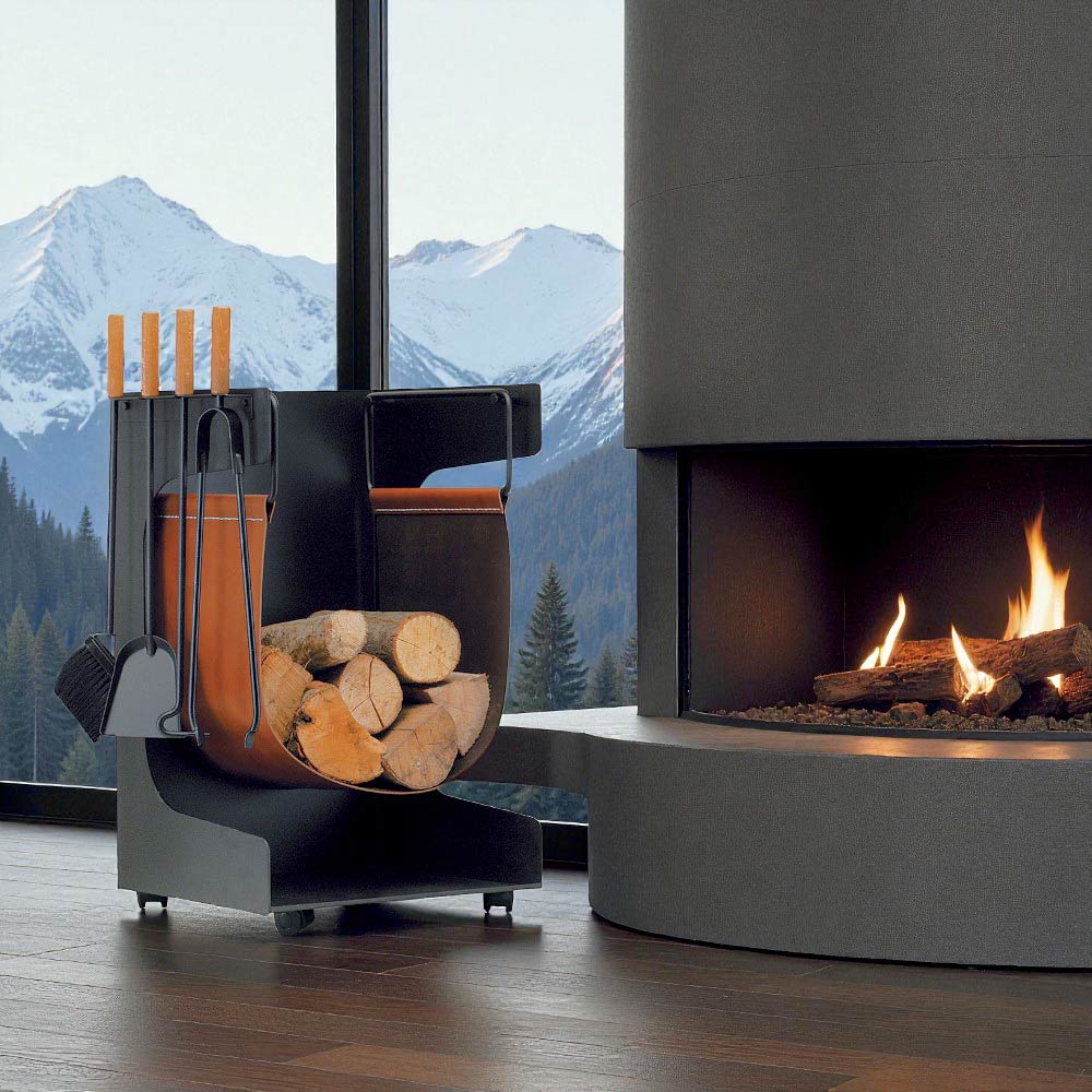 This metal log holder is the example of functionality meeting elegance. Its clever design not only serves as a handy wood storage case, keeping your logs tidy and within reach, but also includes a set of fireplace tools , neatly housed in vertical holders for easy access: a brush, a dustpan , a hook and a clamp .
