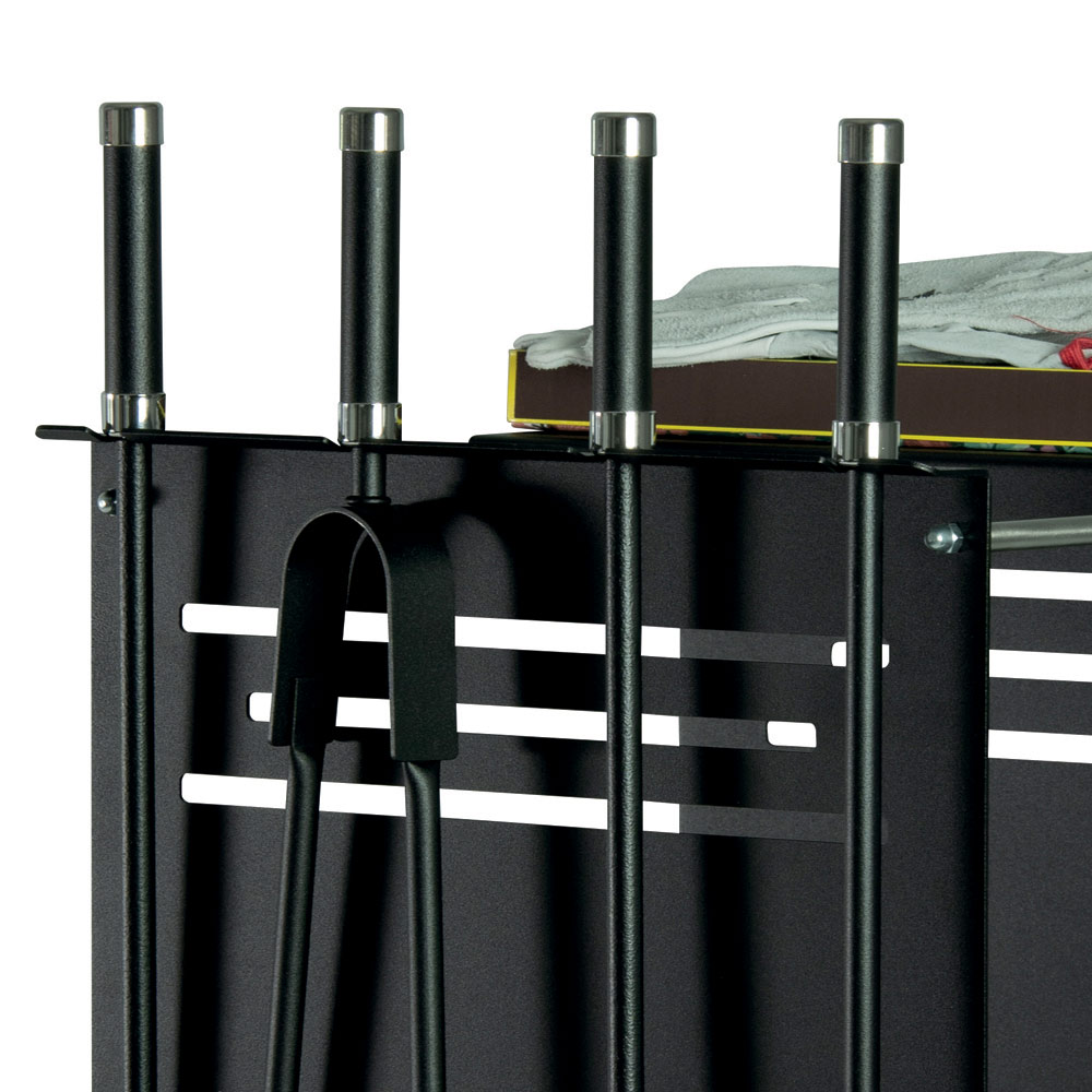 This multifunctional log holder is an essential accessory for fireplace lovers. Made with a sturdy metal structure, it is equipped with wheels to facilitate movement. The unit not only serves to hold a good amount of firewood but also offers dedicated space for the tools necessary for fire management: a shovel, a brush, a clamp and a hook, thus maintaining order and practicality .