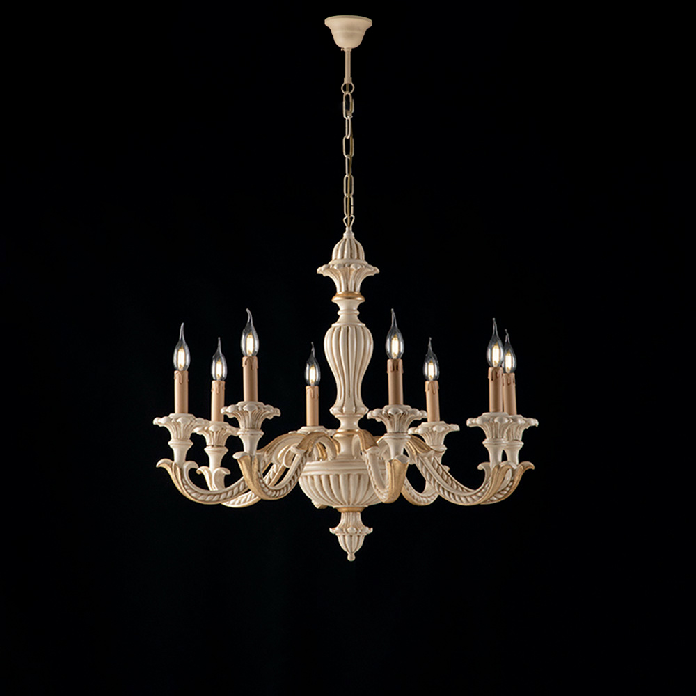 Available in the delicate Shabby White finish, with a romantic and luminous character, or in the precious Ivory with Gold Leaf variant, ideal for elegant and representative environments, this chandelier fits harmoniously into living rooms, dining rooms, important entrances, classic lounges and prestigious contract environments .