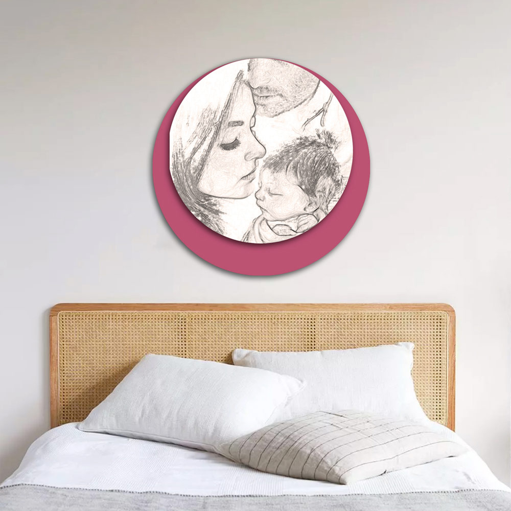 Love, affection, protection are the emotions that arise when looking at this painting in which the family is united and has a game of glances in which he looks at her, she looks at her son who is facing her. The finishes, the wood chosen for the production and the printing technique highlight all the