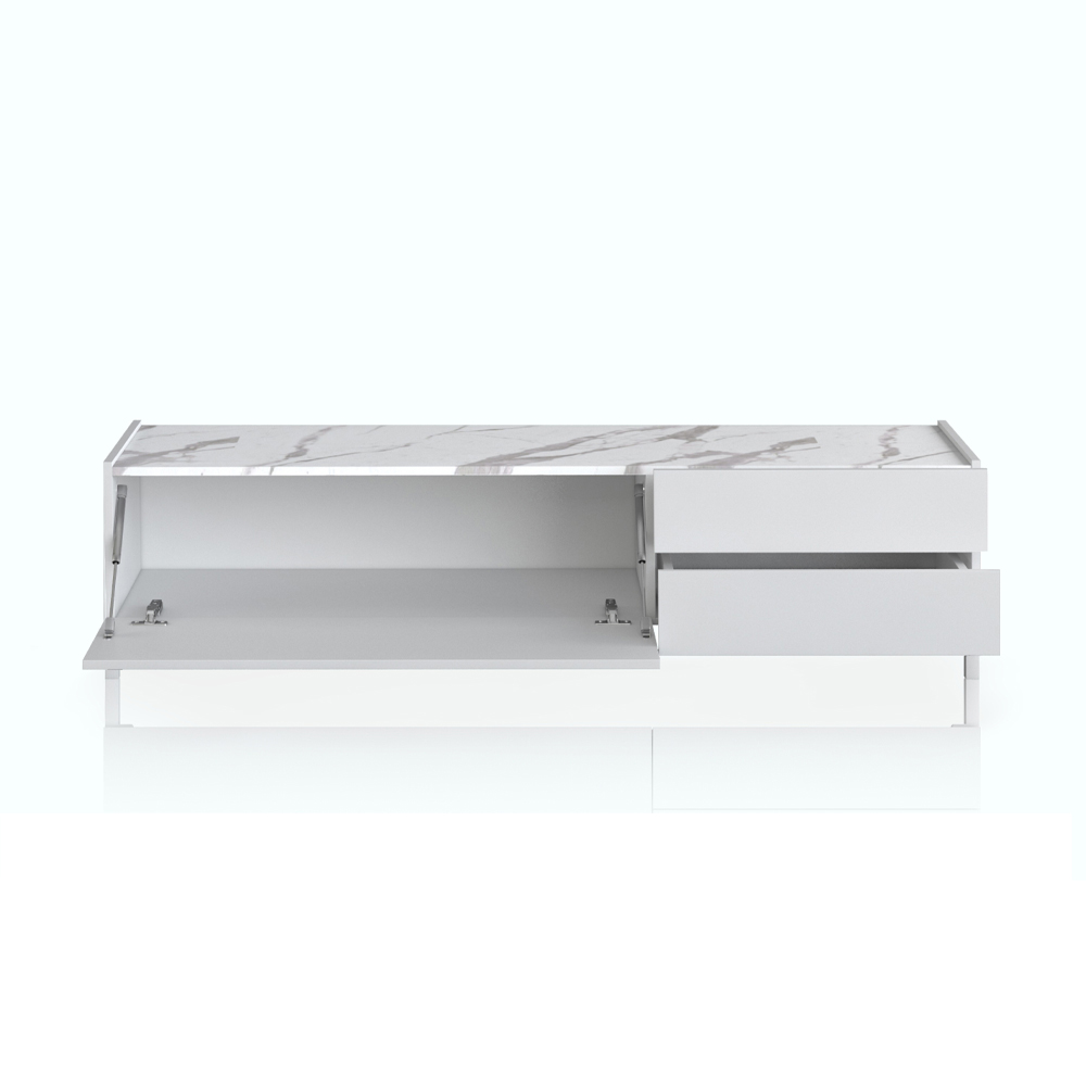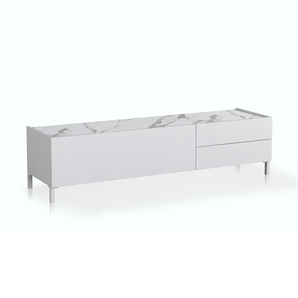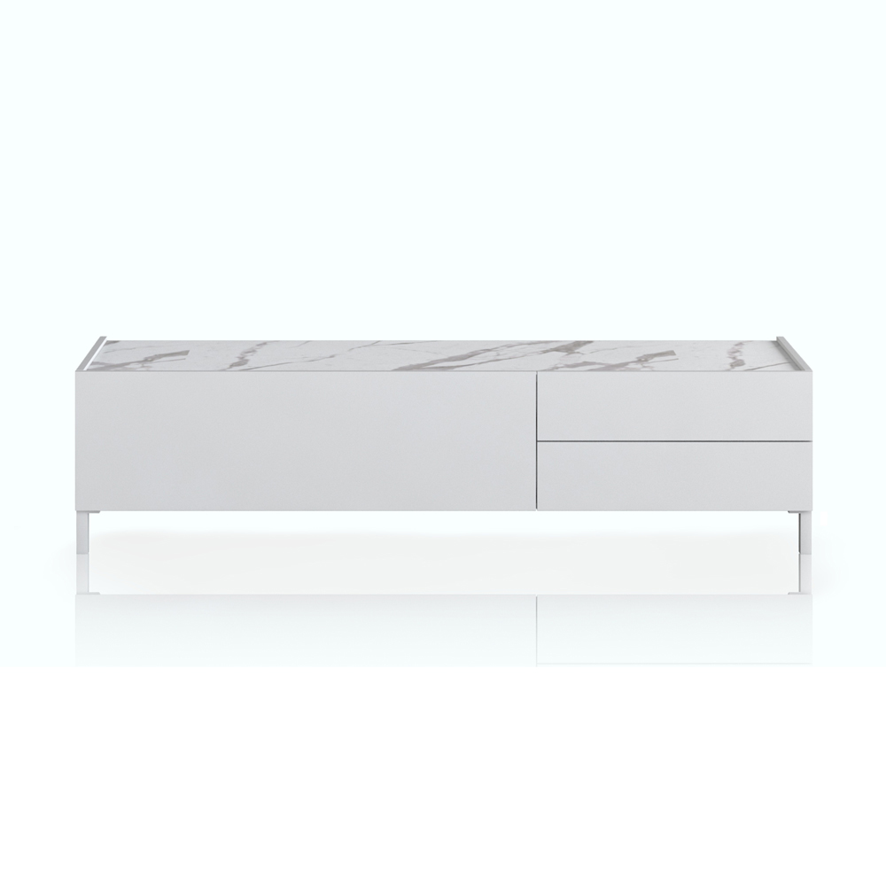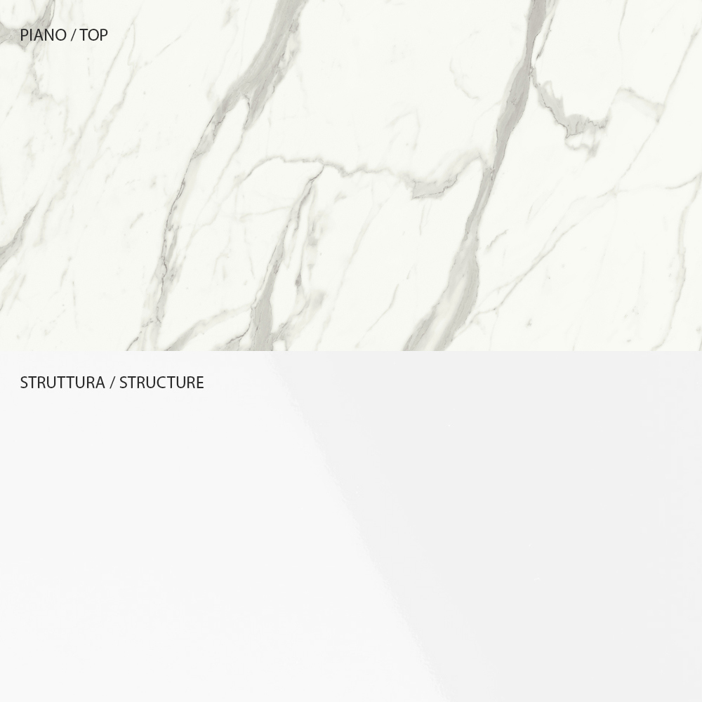 glossy white lacquered , top covered in melamine with Calacatta Marble finish
