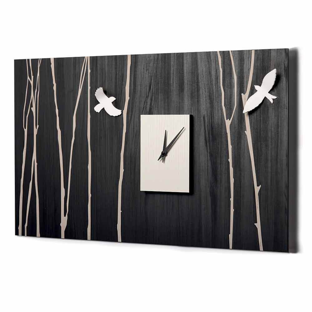 This wall clock is made of blackboard-colored wood with the representation of laser-marked winter branches and three-dimensional decorations such as the wooden bird house and the birds in opaque methacrylate.