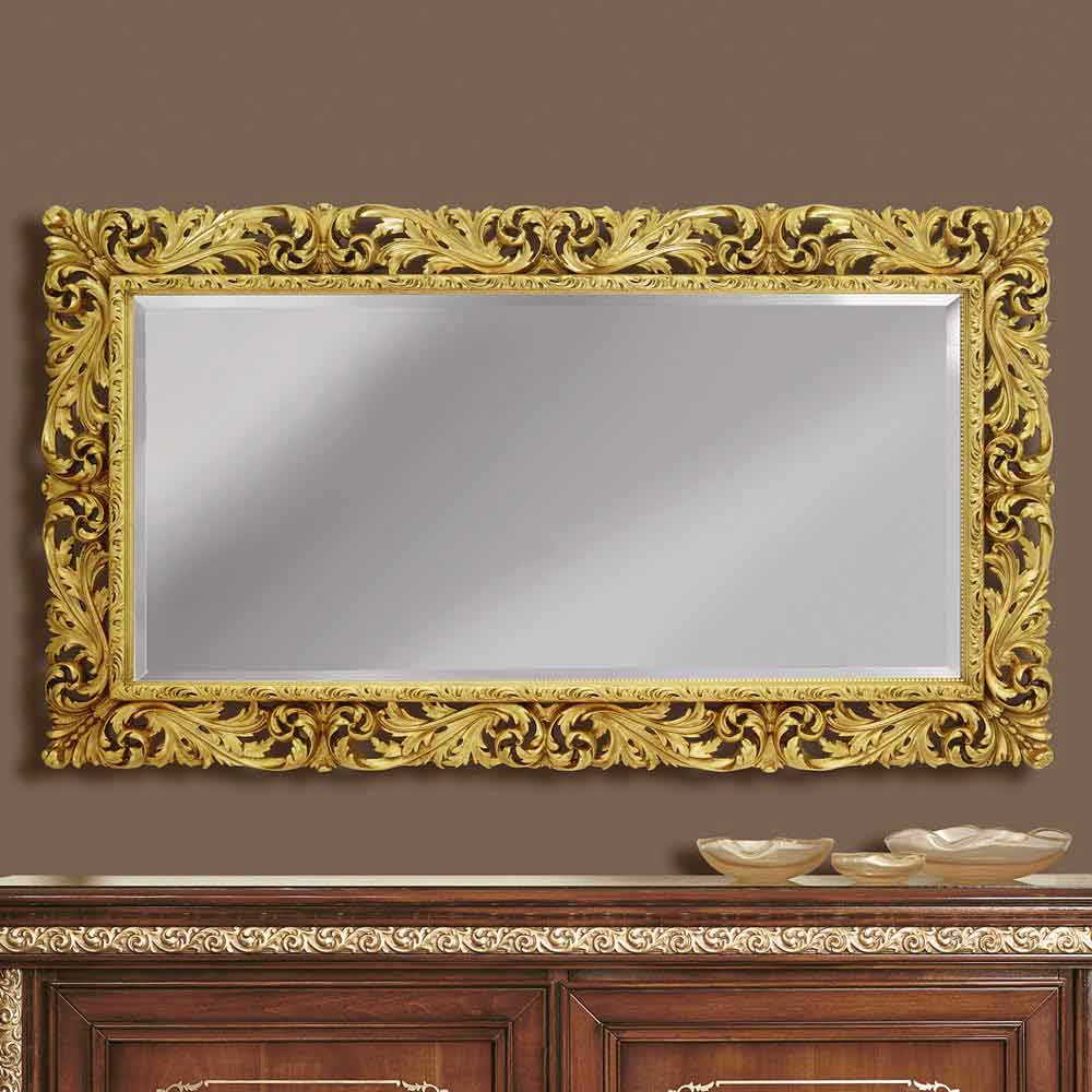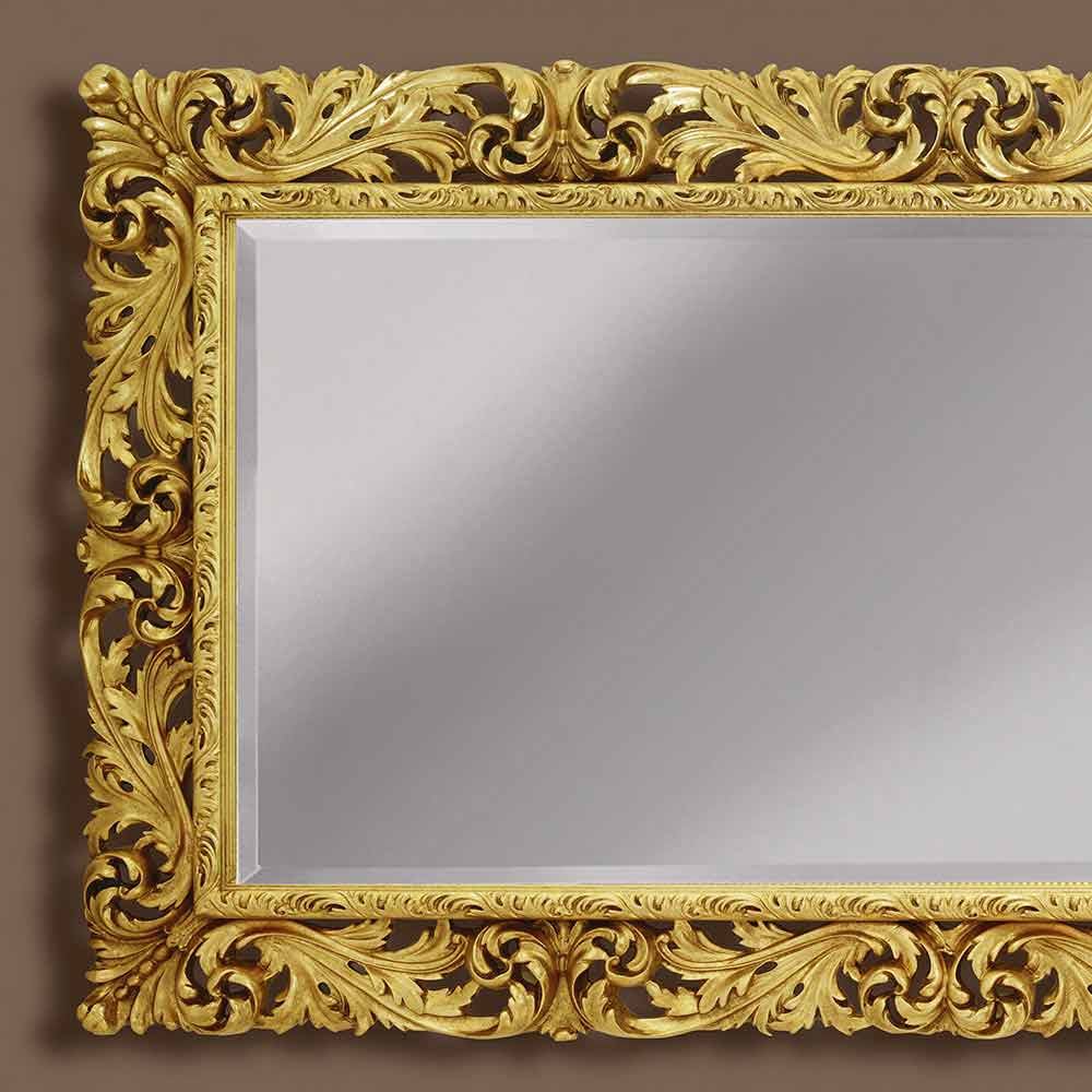 This impressive mirror is a masterpiece of craftsmanship that celebrates the magnificence of the Baroque style. The frame is an intricate weave of acanthus leaf and floral motifs, each carefully chiseled to create a three-dimensional effect that is both tactile and visually stunning.