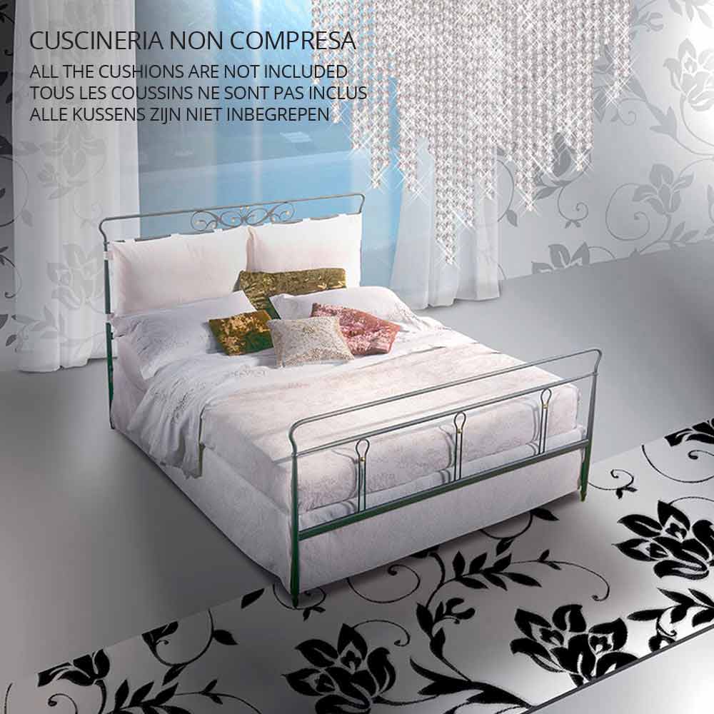 The wrought iron bed in the DOUBLE HEADBOARD WITH FOOTBOARD AND CONTAINER variant includes a slatted base that can accommodate a 160 x 190 cm mattress. The base we supply has a special mattress retaining system that allows it to also accommodate a 190 cm long mattress. In case there are particular aesthetic needs, this model, thanks to our artisan productivity, can be modified in height. The container is made entirely of metal and can be painted in any colour. Having a metal container guarantees countless advantages to our bed including solidity, ease of cleaning and greater capacity. The container can in any case be combined with a textile valance. This version with footboard for example can only be made thanks to the metal structure of the container, a very welcome combination because it allows you to combine the classicism of a complete bed with the convenience of using the storage space.